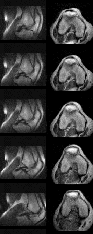 The system has a large 160mm uniform field of view providing generous coverage for full knee examinations. The ultra-light magnet weight (500Kg) means the system can be installed in any office. Sub mm resolution can be achieved in short scan times, usually 2-4 minutes. A 200 x 750mm magnet aperture provides more vertical access than most whole body MRI systems enabling full flexion knee studies as seen above clearly showing the extension of the anterior cruciate ligament in the sagittal sections. Four high quality RF coils are provided as standard, two with full volume coverage for the upper and lower extremities and two coils designed especially for limb rotation studies. The system uses a set of clinical protocols optimized for extremity imaging. Advanced user sequence development capability is provided as a research option for full flexibility.